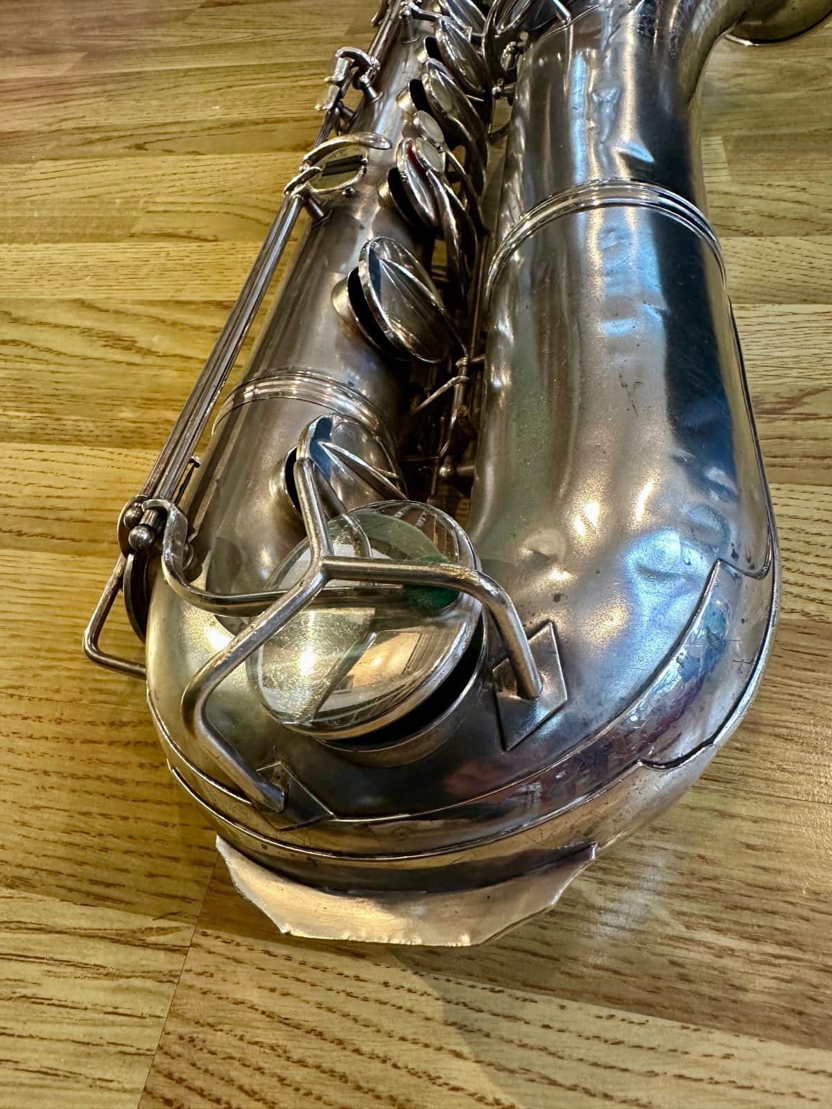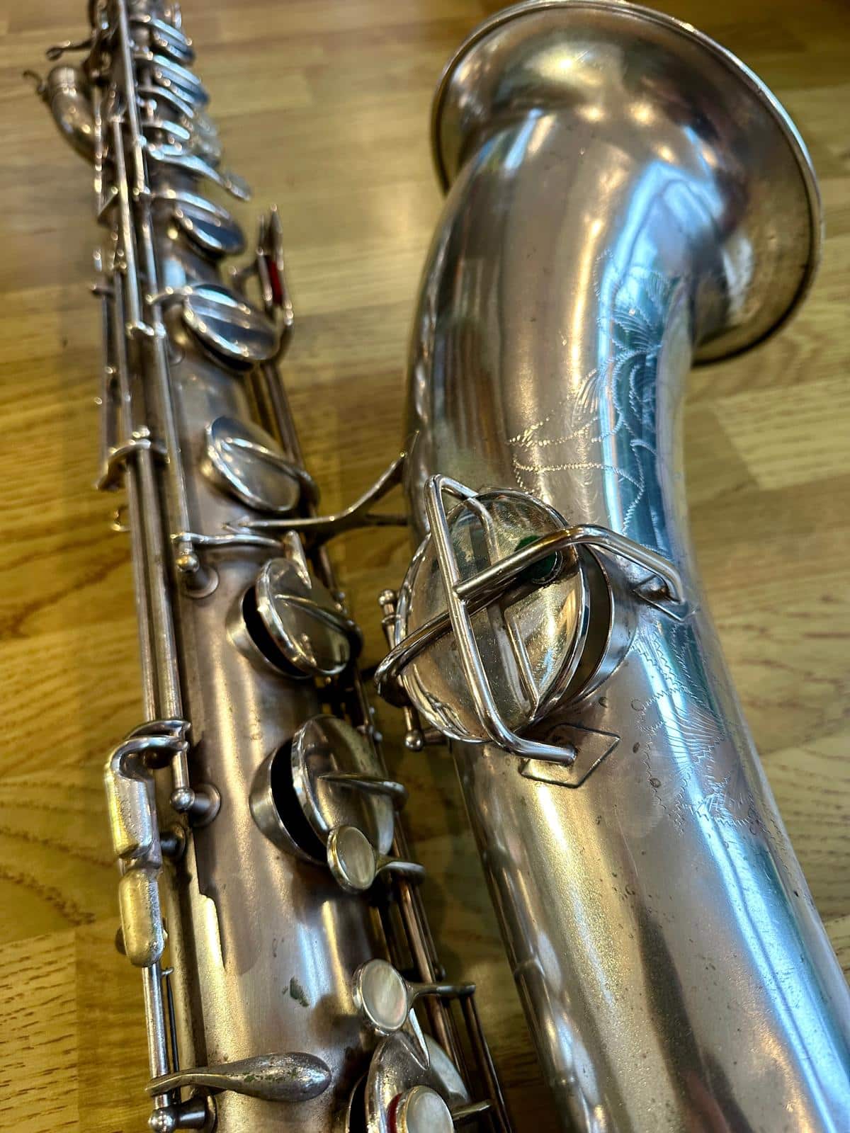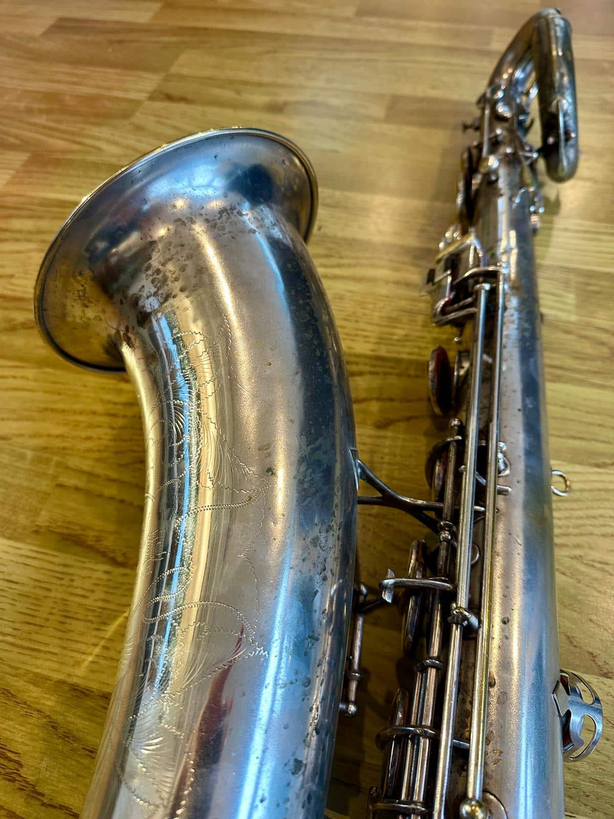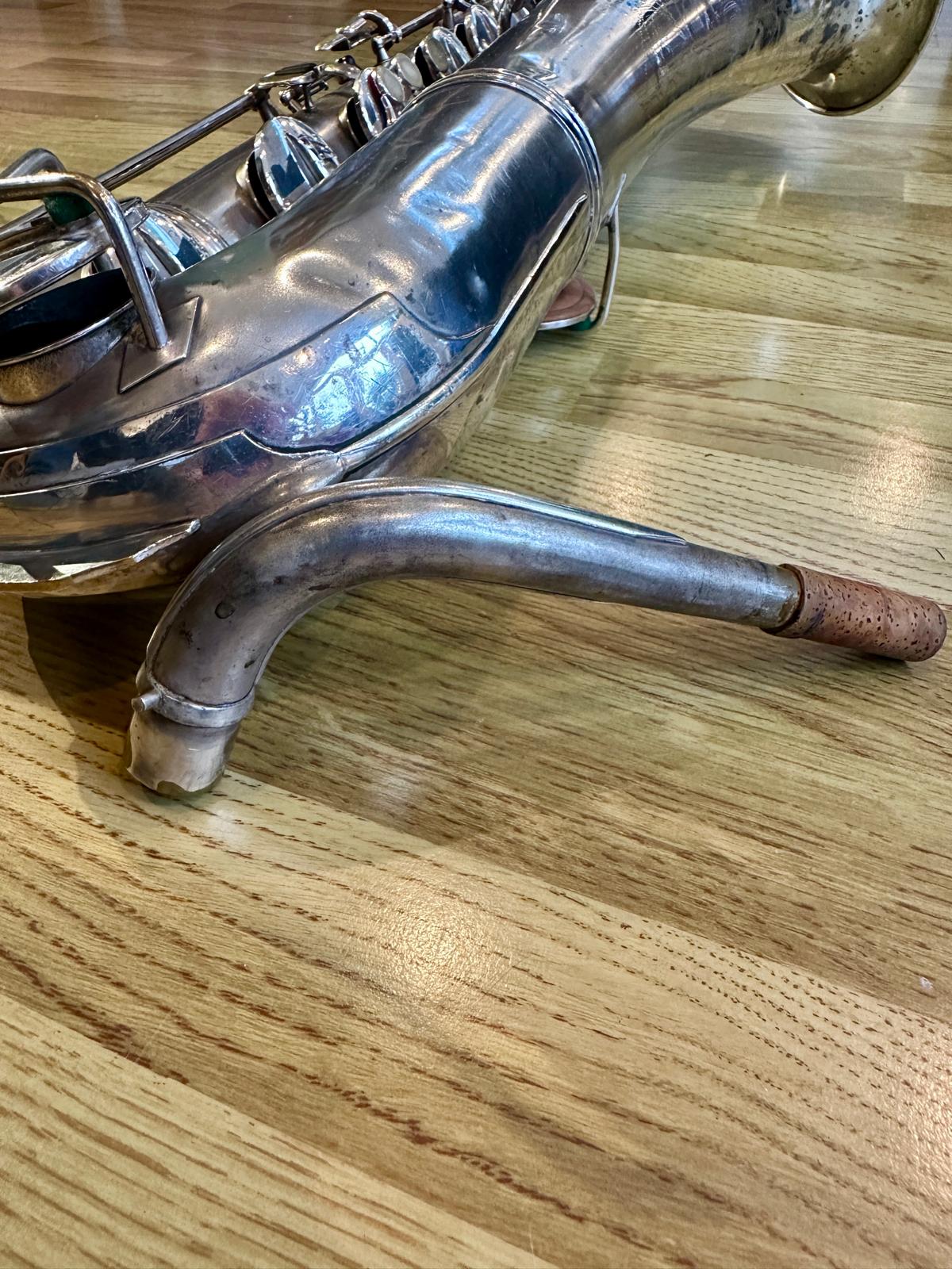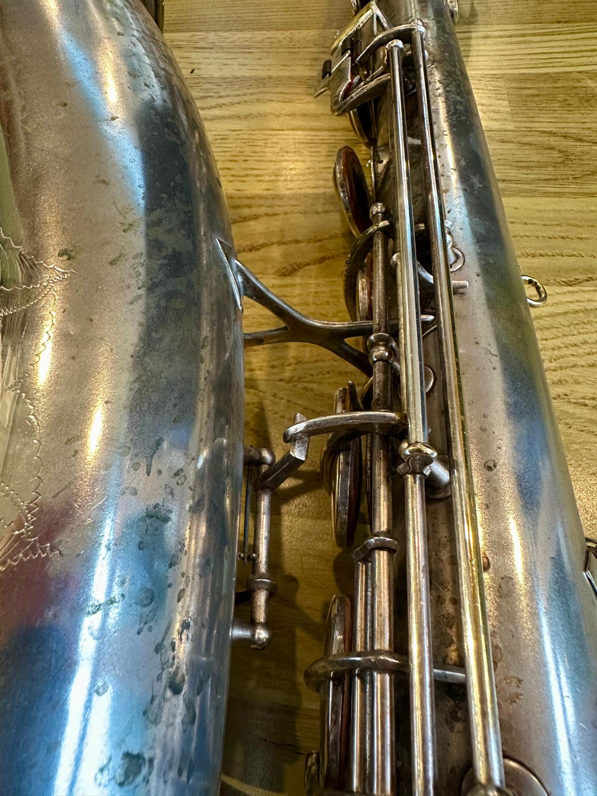 This one has the serial number 143XXX and was made in 1924. It is finished in its original silver plate and looks stunning. It is nicely padded, recently serviced and setup, and blowing amazing! There are very few, if any, horns that can match these early Conns in sound and bang for your buck. it is to be noted with this model that it is only keyed to high Eb and does not have a front F key. It does however feature the infamous ‘crossbar’ bell to body brace.