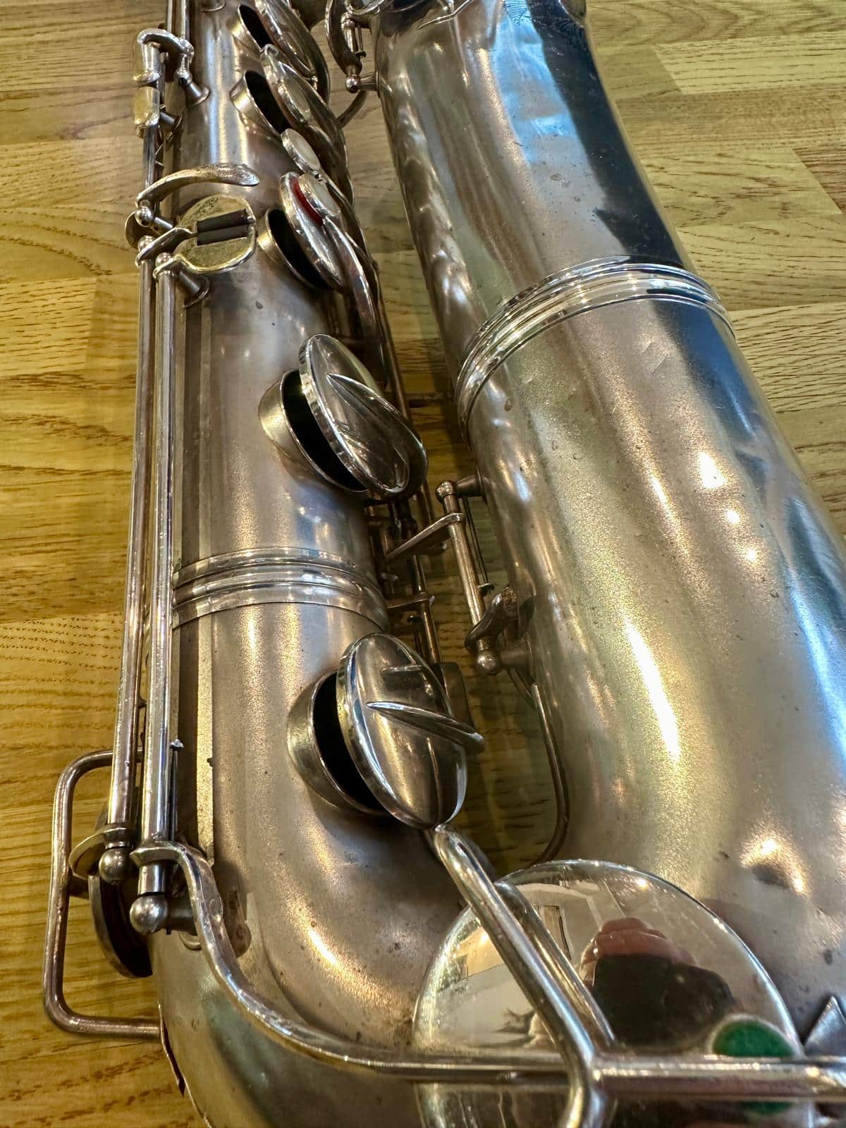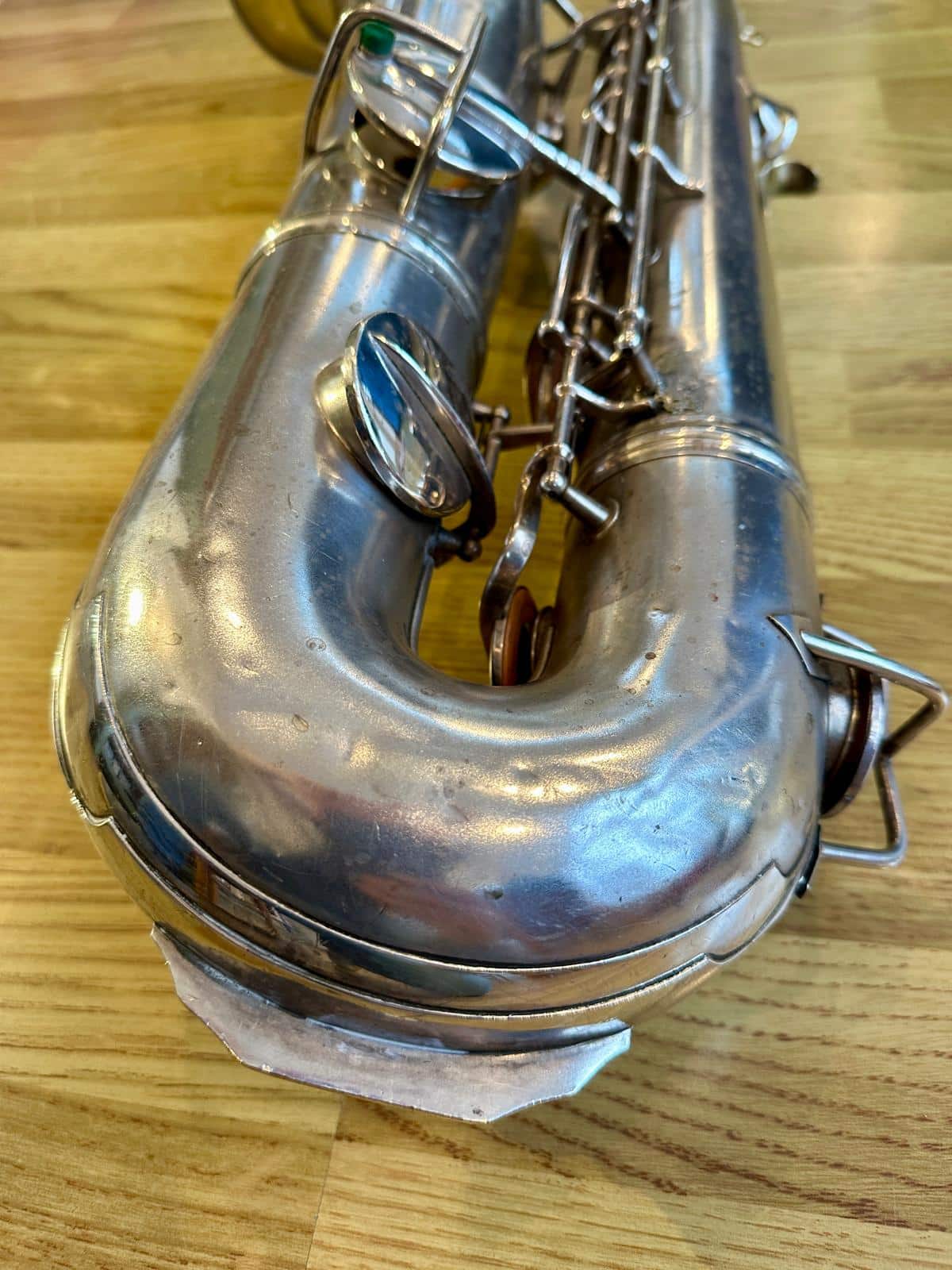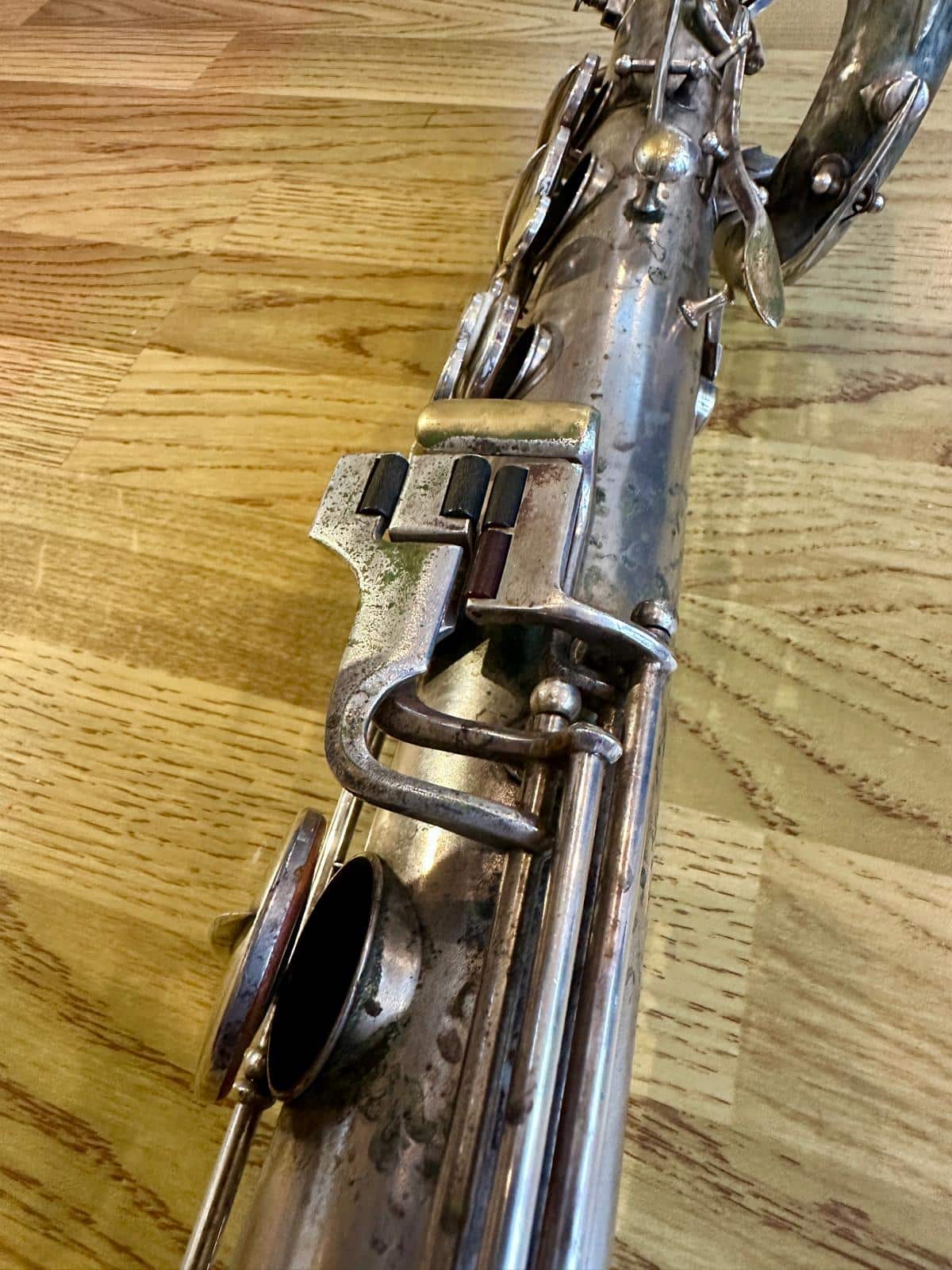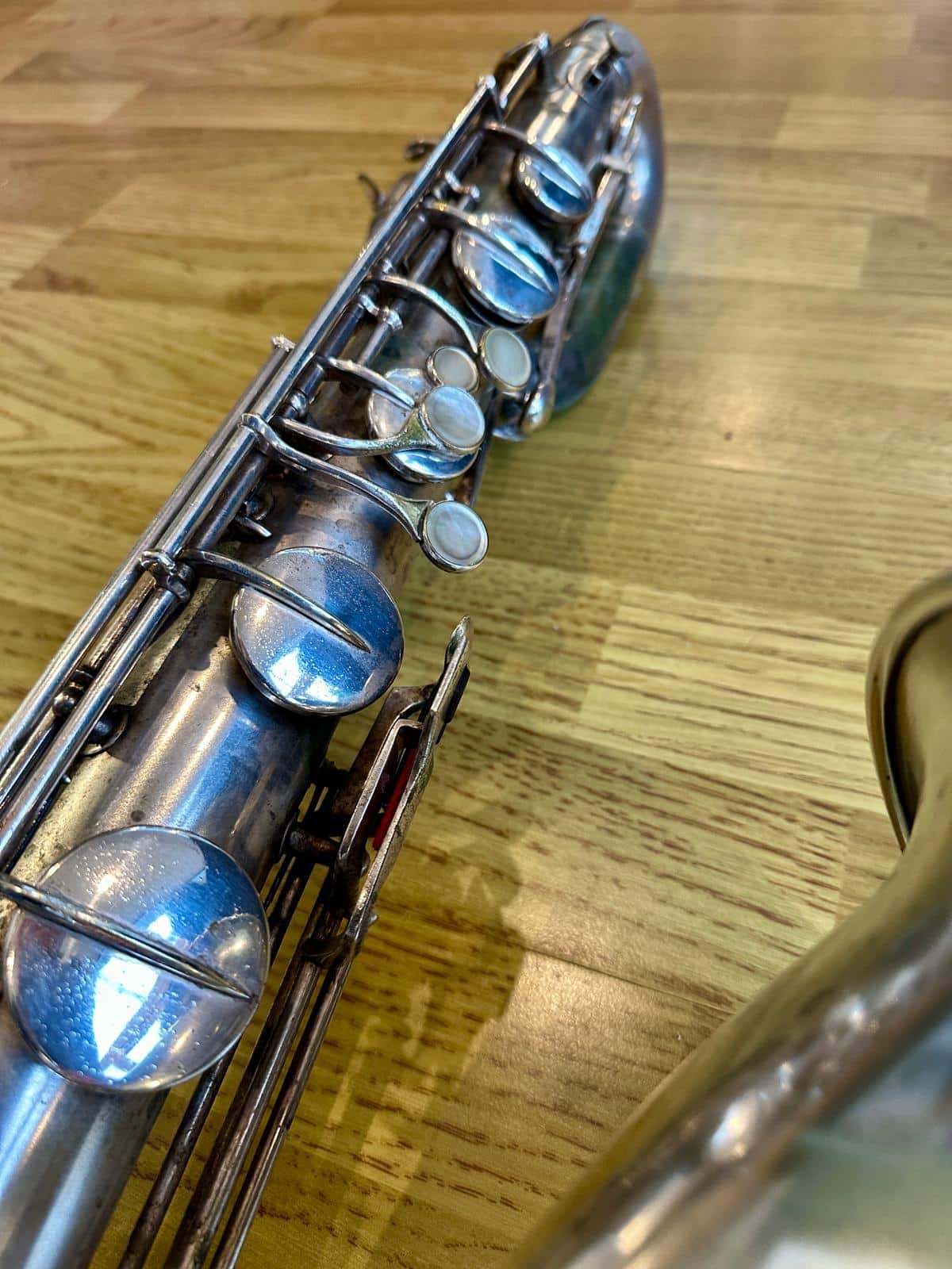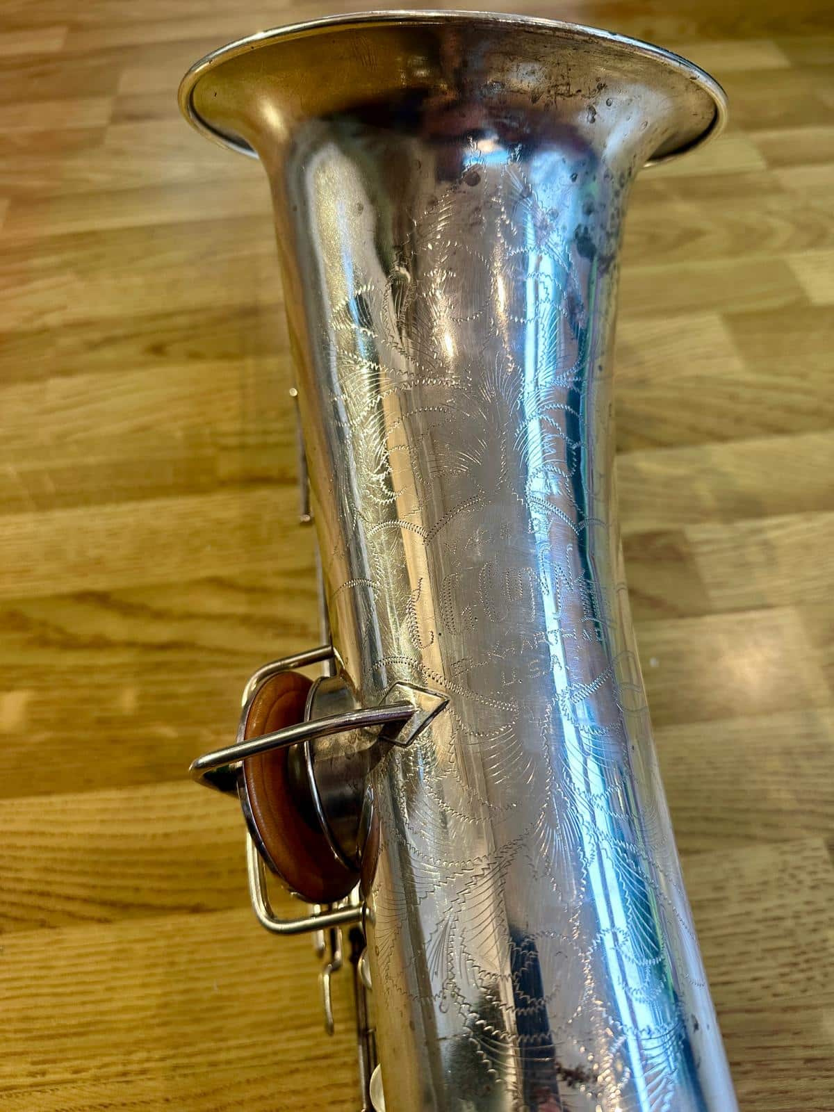 This one has the serial number 143XXX and was made in 1924. It is finished in its original silver plate and looks stunning. It is nicely padded, recently serviced and setup, and blowing amazing! There are very few, if any, horns that can match these early Conns in sound and bang for your buck. it is to be noted with this model that it is only keyed to high Eb and does not have a front F key. It does however feature the infamous ‘crossbar’ bell to body brace.