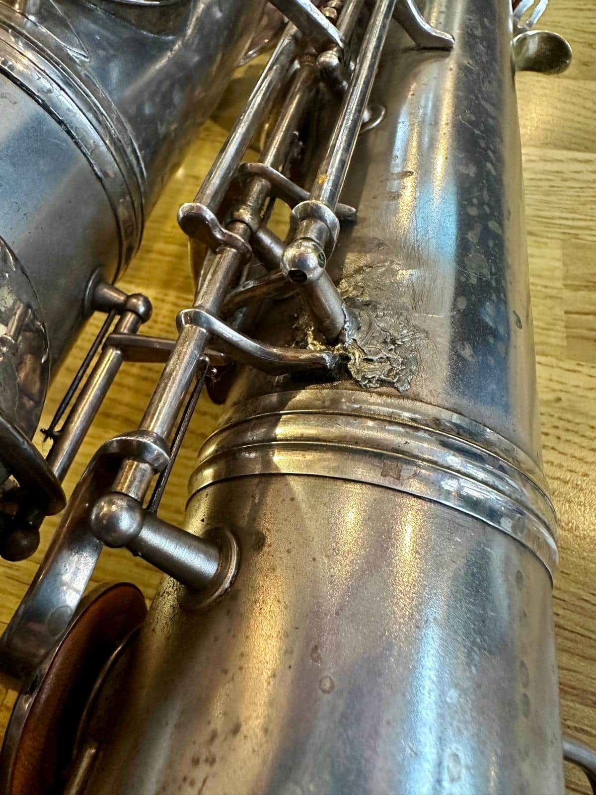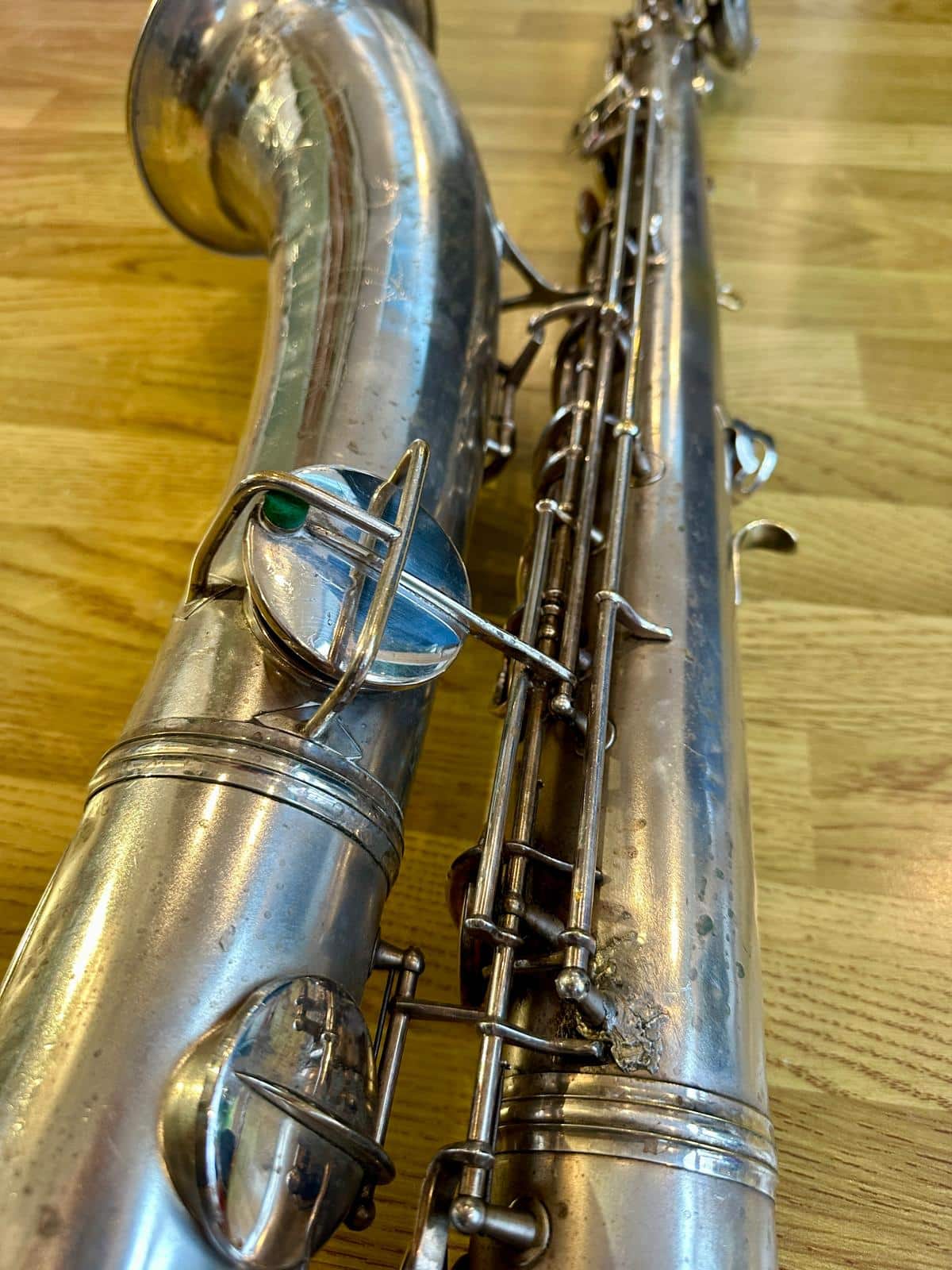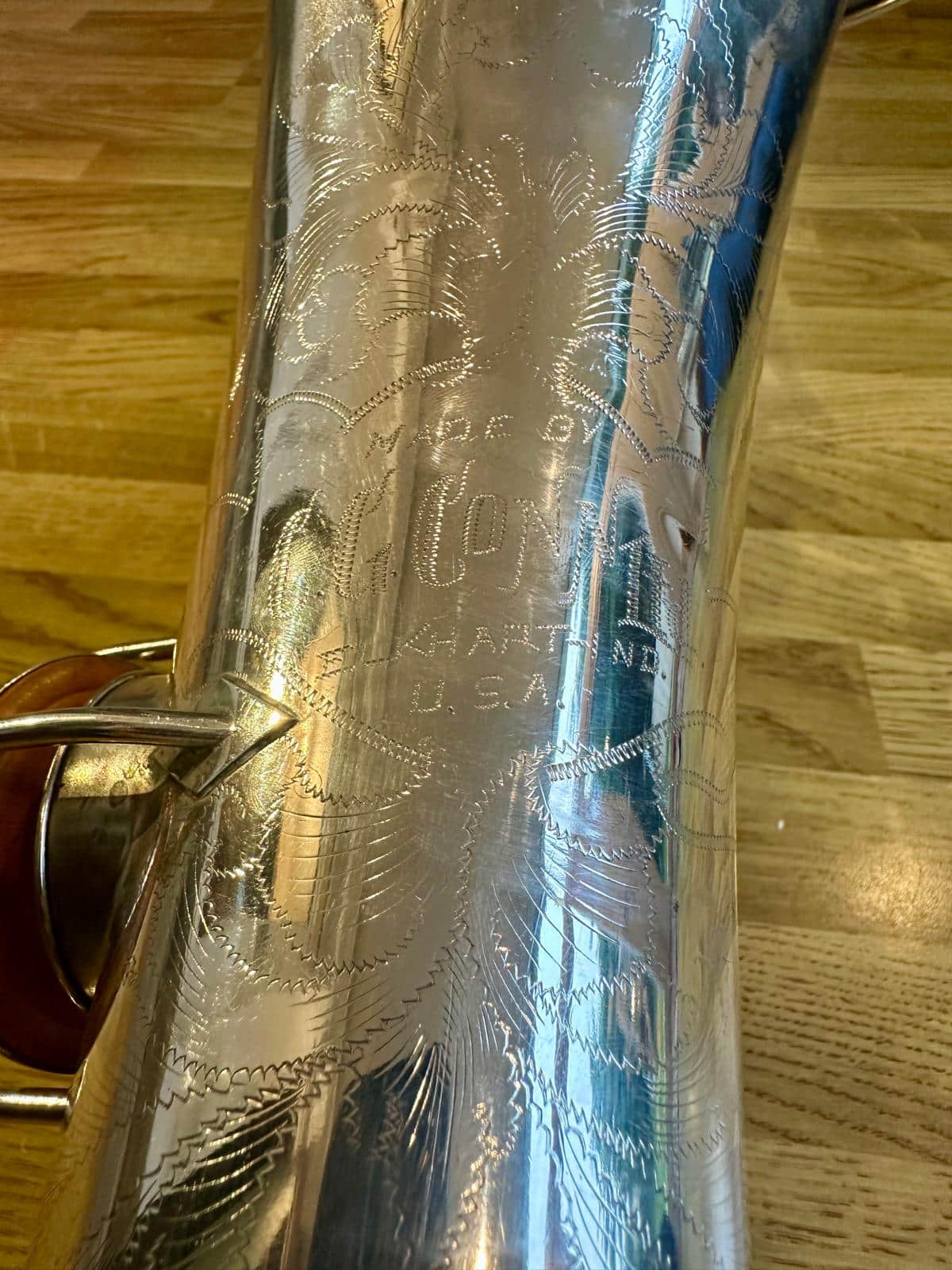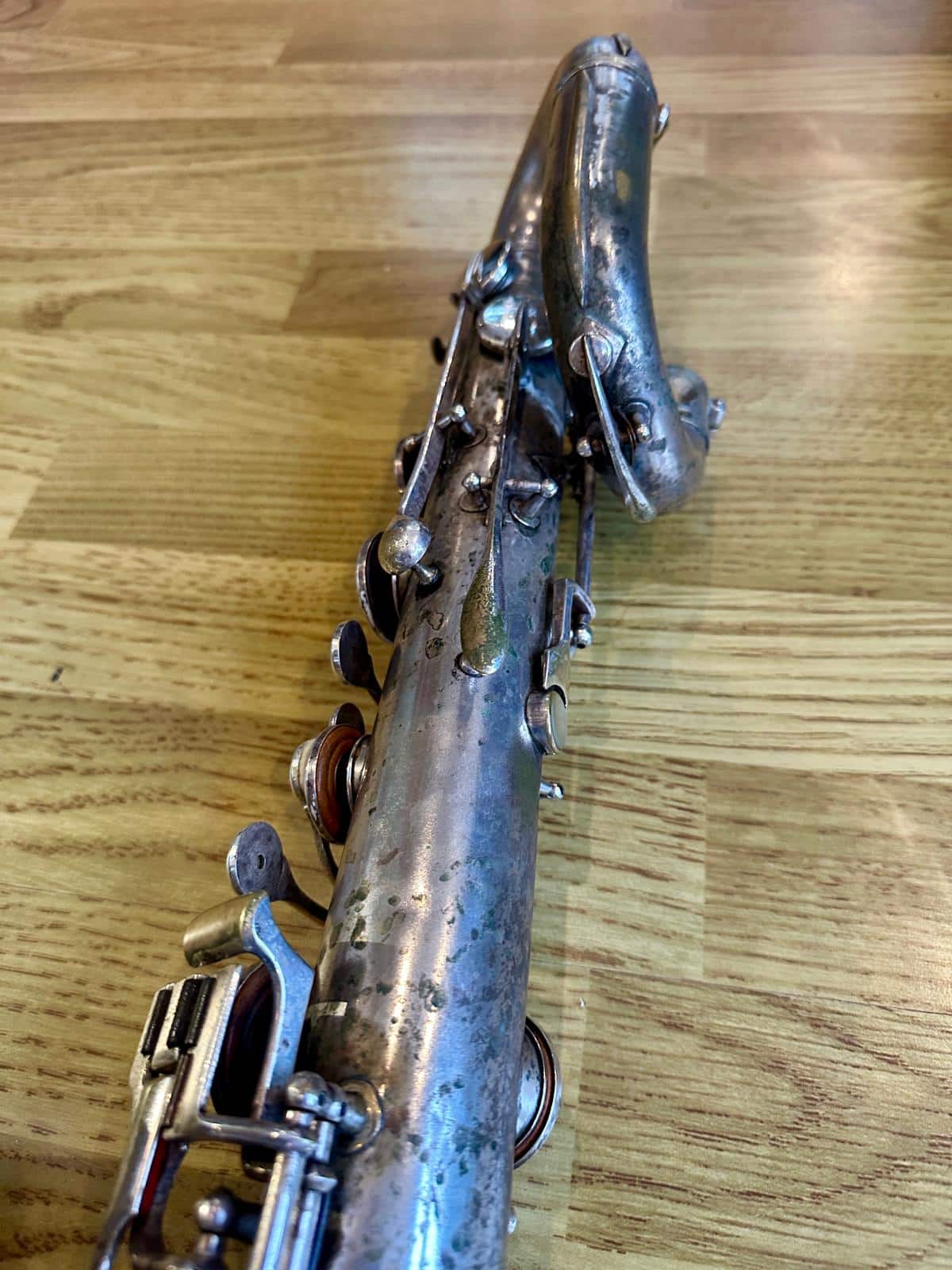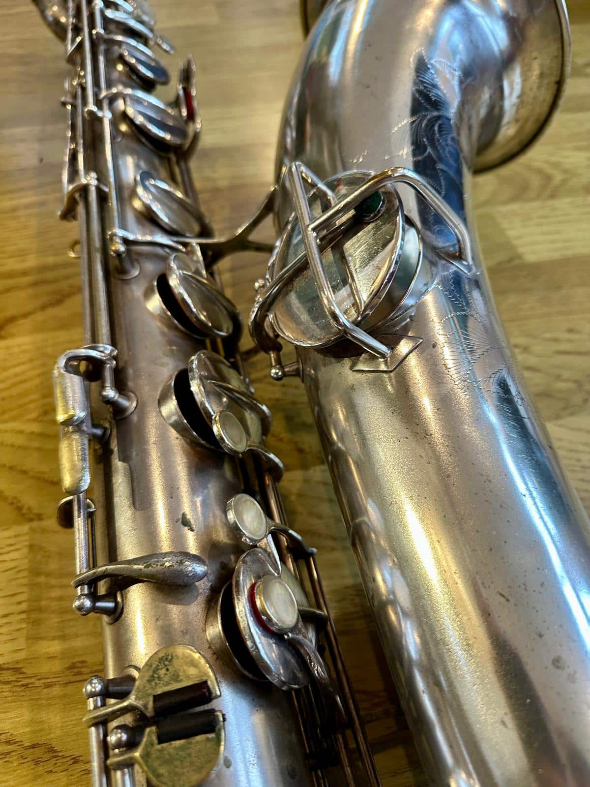 This one has the serial number 143XXX and was made in 1924. It is finished in its original silver plate and looks stunning. It is nicely padded, recently serviced and setup, and blowing amazing! There are very few, if any, horns that can match these early Conns in sound and bang for your buck. it is to be noted with this model that it is only keyed to high Eb and does not have a front F key. It does however feature the infamous ‘crossbar’ bell to body brace.